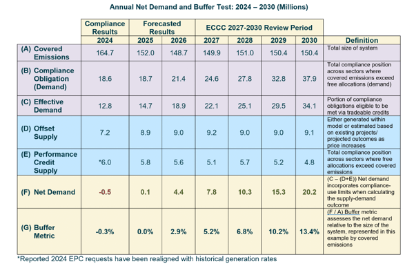 Curtis also presented ClearBlue's supply and demand modeling out to 2030, highlighting that while the program could go structurally short by 2030. His slides on the Annual Net Demand and Buffer Tests showed that the market could face 20 million credits in annual demand by the end of the decade, potentially depleting the entire surplus bank of credits.